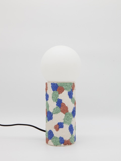 Pièce unique. Cette lampes à poser Terrazzo jaune 01 est réalisée en carton, papier et panneau de bois recyclés. Aucun produit chimique n’est utilisé.