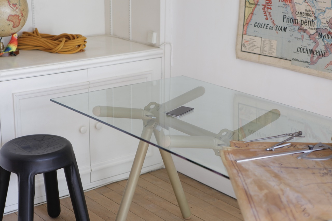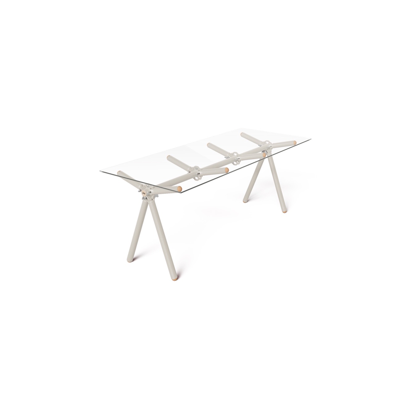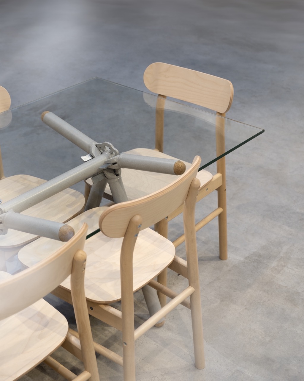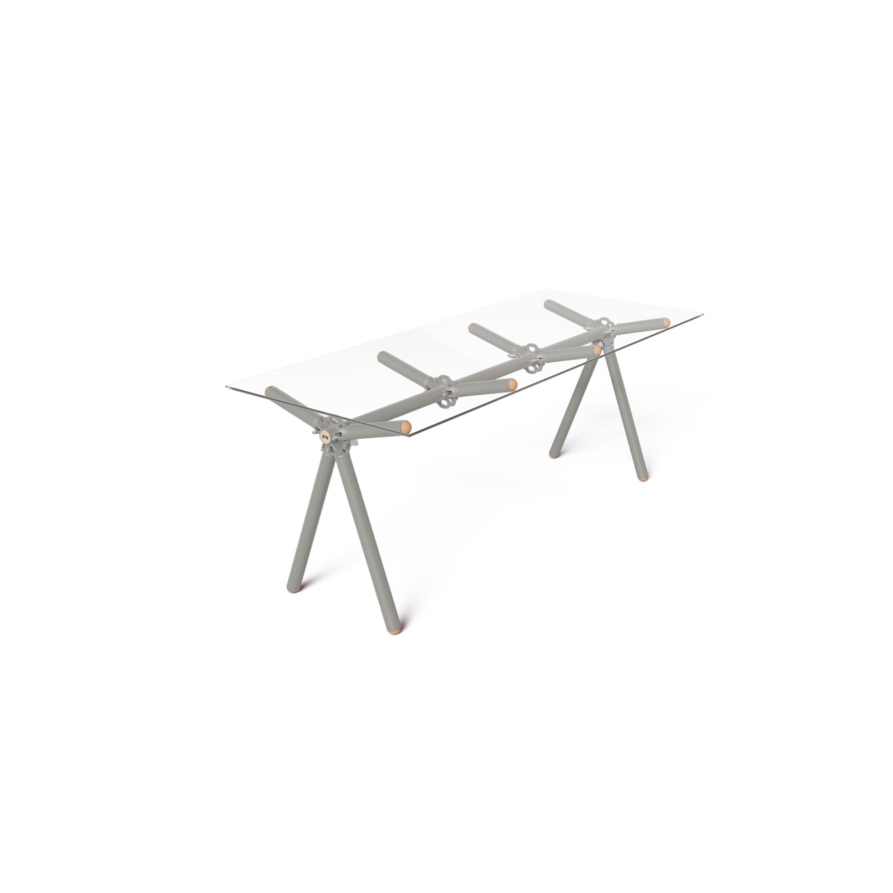 Le liège utilisé pour finir l’extrémité des tubes d’échafaudages est issu de bouchons de vin broyés. Le plateau de verre est simplement posé dessus et c’est juste ce qu’il faut pour ne pas qu’il glisse.